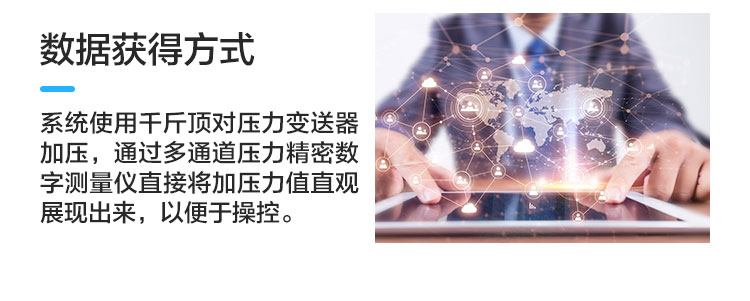 數(shù)據(jù)獲得方式:系統(tǒng)使用千斤頂對壓力變送器加壓,通過多通道壓力精密數(shù)字測量儀直接將加壓力值直觀展現(xiàn)出來,以便于操控。